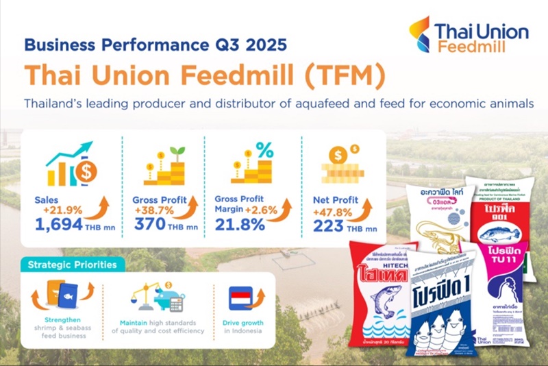Bangkok – October 31, 2025 – Thai Union Feedmill Public Company Limited (TFM), a leading Thai manufacturer and distributor of aquafeed, announced record-breaking performance for Q3/2025, with sales reaching THB 1,694 million, a 21.9% increase, and net profit of THB 223 million, up 47.8%. This reflects the strength across all business segments, particularly the shrimp feed segment, which saw significant growth in both Thailand and Indonesia. The company continues to implement strategic business restructuring to enhance efficiency and reinforce its position as a leader in sustainable aquafeed.