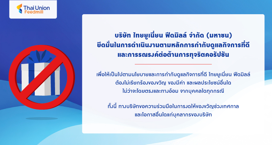 เรามุ่งมั่นในการศึกษาและพัฒนาอาหารสัตว์น้ำ ที่มีความยั่งยืนของห่วงโซ่อุปทาน และให้คำมั่นสัญญาที่จะลดผลกระทบด้านสิ่งแวดล้อม ซึ่งอยู่บนพื้นฐานของกฎหมาย รวมทั้งส่งเสริมและยกระดับความเป็นอยู่ของสังคม
